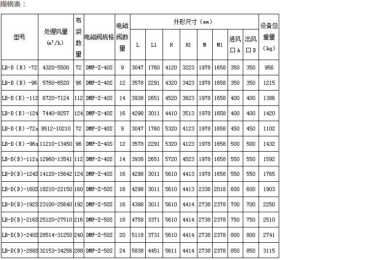 注:LB-DMC(B)-72---LB-DMC(B)-124選用布袋規格:130*1600mm
