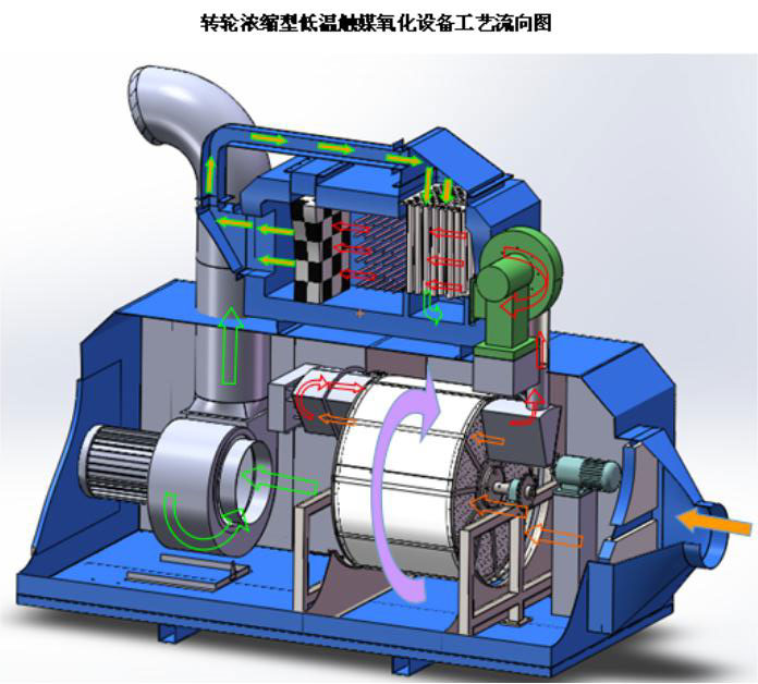 轉(zhuǎn)輪濃縮型低溫觸媒氧化設(shè)備:是采用轉(zhuǎn)輪式吸附床對(duì)有機(jī)廢氣進(jìn)行吸附濃縮,濃縮的有機(jī)廢氣在脫附再生區(qū)被脫附后,被再生風(fēng)機(jī)引入催化燃燒凈化裝置,進(jìn)一步凈化處理。整個(gè)裝置分為VOC濃縮區(qū)和濃縮后VOC凈化處理區(qū)兩大模塊。